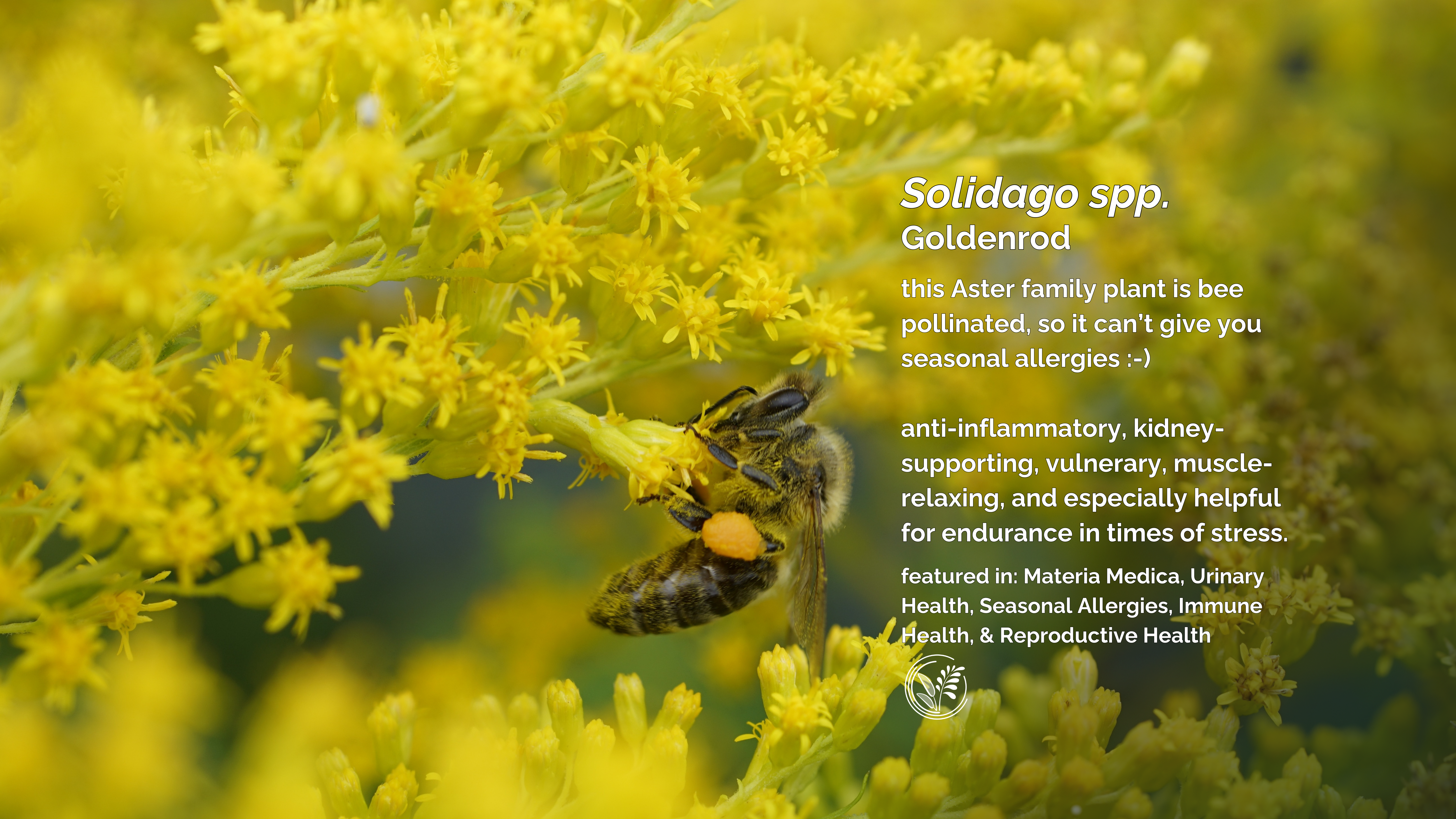 This week we’re featuring Goldenrod, Solidago spp., which is a super helpful herb in about a million ways – but many people think that it is a cause of seasonal allergies. It’s not! Goldenrod is bee-pollinated (and lots of other pollinators love it too, like butterflies!) – its pollen is too heavy to be carried in the air, which means it’s not the reason you’re sneezing. But, Goldenrod CAN help fight seasonal allergies – that’s one of its super powers! Most of the time you hear that attributed to its ability to support the kidneys, and that does help a lot. But did you know that Goldenrod also helps keep your mucous membranes healthy – not too drippy, not too dry!